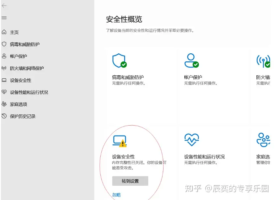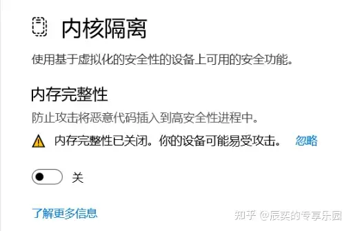 在该界面可以看到出现安全警告的原因是“内存完整性已经关闭”,如果想偷懒且又不想在桌面任务栏看到安全中心图标中出现黄色警告小三角,这里可以之间点击“忽略”即可。但是后面一句话提示如果不处理的话设备可能易受攻击,对于想我这样重视信息安全的人来说这是不能忍受的,因此点击“转到设置”按钮尝试解决该问题。