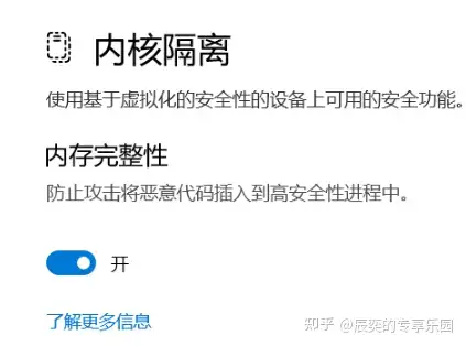 “核心隔离是 Microsoft Windows的一项安全功能,它通过在内存中隔离Windows的重要核心进程,使其免受恶意软件的侵害。 它通过在虚拟化环境中运行这些核心进程来实现此操作。”