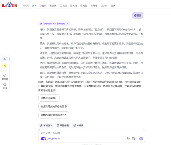在被问及“你是谁”时,会直接回答:“是由中国的深度求索(DeepSeek)公司开发的智能助手DeepSeek-R1,当前由百度提供计算服务支持。”