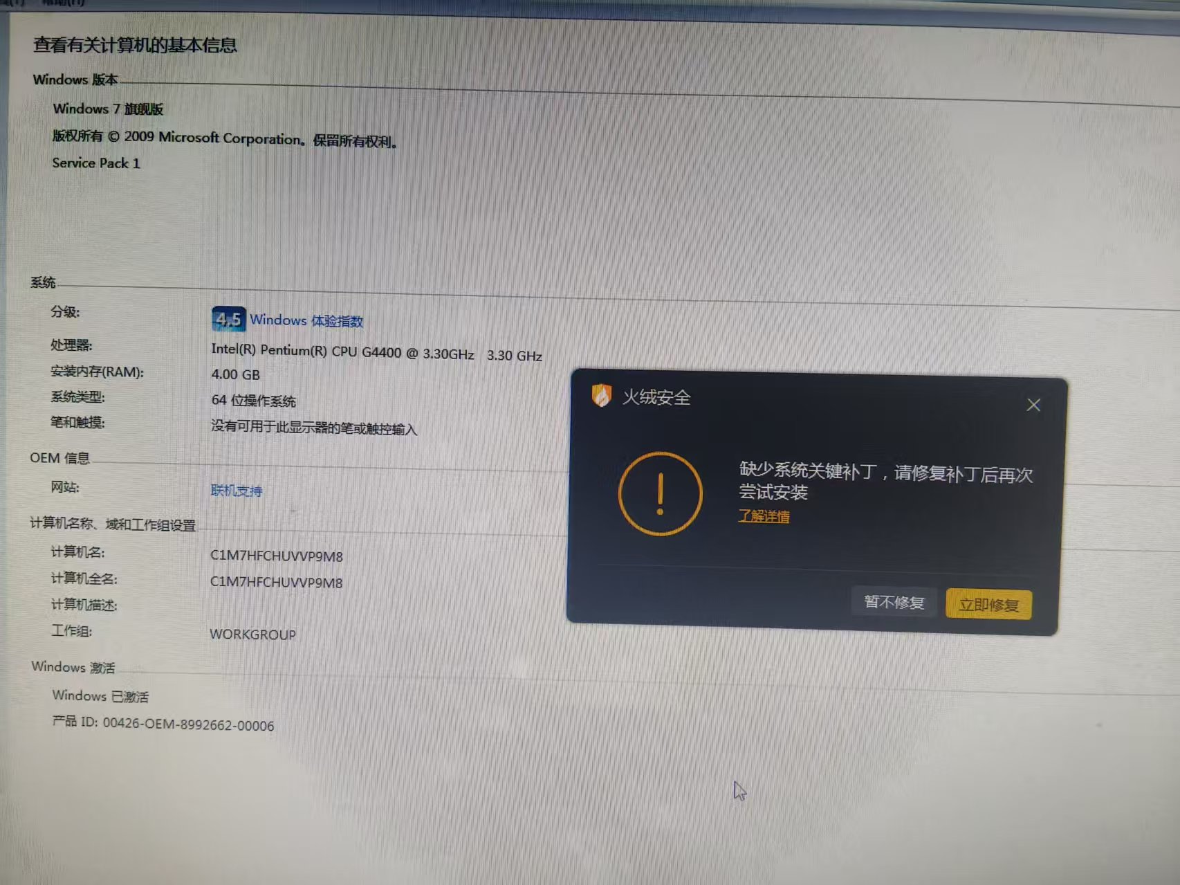 | 楼主这个Windows7系统不是sp1版本,导致火绒无法安装,本人在虚拟机中复现过,新版火绒对这个系统不友好 |