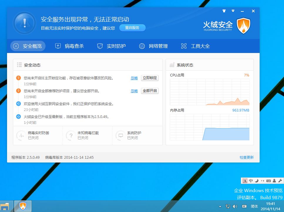 系统是最新的win10 x86企业版9879 火绒2.5无法启动服务 主动防御失败