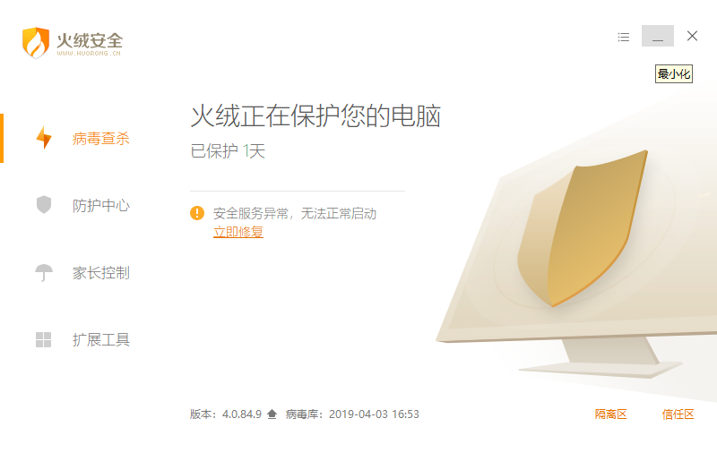 你是不是安装第三方杀毒软件了?那个软件禁止火绒启动?一般这种情况,先卸载其他的杀毒软件,再重新启动系统就可以了。
