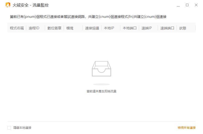 您好,您是说流量监控中查看所有连接没有显示是吗,我们这里本地是有实时流量显示的。建议您重新安装最新版本火绒然后重启电脑试试或者查看一下您当前网络环境~希望可以帮到您~感谢您的反馈 |